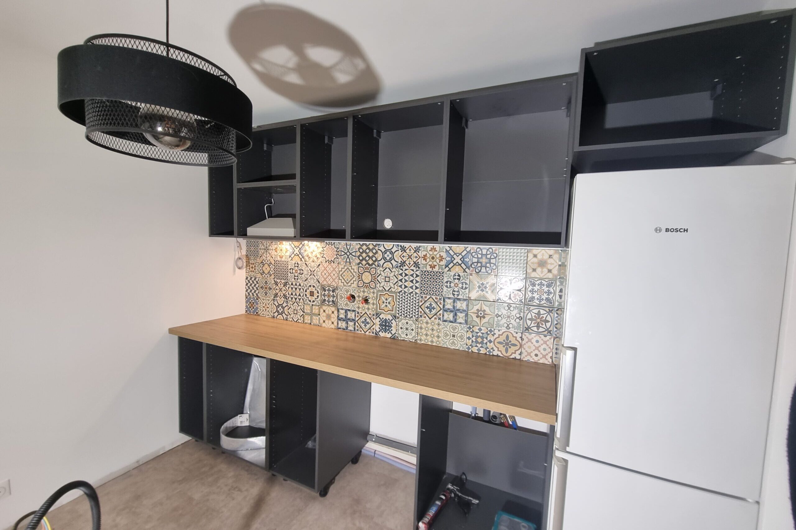 J’ai travaillé sur 3 pièces : la cuisine, le salon/salle à manger et la mezzanine. Les travaux réalisés : la cuisine ( j’avais promis à Madame une nouvelle cuisine pour Noël, et je tiens toujours mes promesses ) , l’achat du mobilier et déco du salon / salle à manger, le coffrage de la cheminée, l’installation des verrières ( une sur la cuisine et une sur la mezzanine ), peinture et sol de la mezzanine. Mais, aussi agrandissement de la porte-fenêtre en baie vitrée donnant sur terrasse.