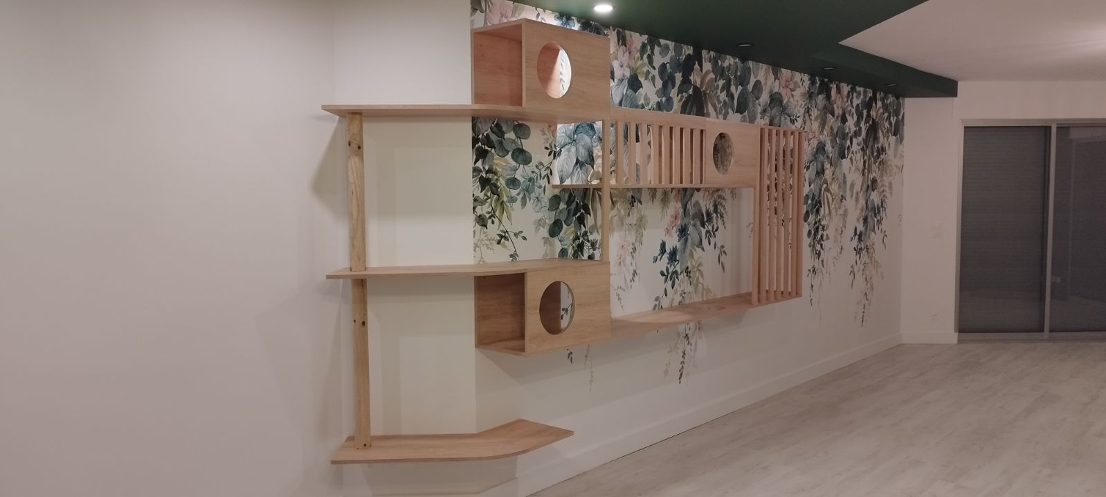 On change la cuisine, réaménage l’entrée, refait la peinture à neuf, on ajoute un poêle et on crée un véritable espace mural pour ses chats.